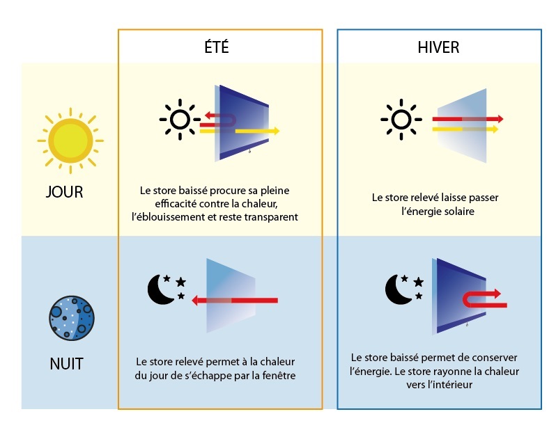 Un vitrage isolant laisse passer environ 80% d’énergie solaire. La température mesurée à proximité directe de la fenêtre peut ainsi atteindre environ 60° C sans protection solaire en été.